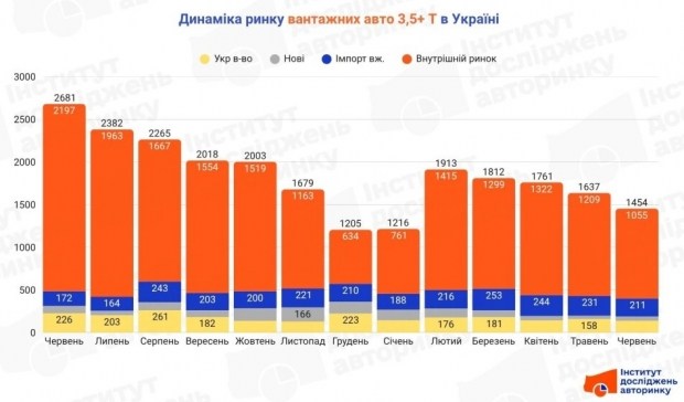 Обсяг ринку вантажних авто з повною масою понад 3500 кг у за підсумками червня 2025 року склав 1,5 тис. шт. У порівнянні з травнем цього ж року це на 11,2% менше, також на 45,8% менше відносно червня 2024 року. Помісячну динаміку можна побачити на діаграмі.