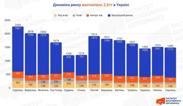 Обсяг ринку вантажних авто з повною масою понад 3500 кг за підсумками серпня 2025 року склав 1490 шт. У порівнянні з липнем цього ж року це на 1,5% менше, а також на 34,2% менше відносно серпня 2024 року. Помісячну динаміку можна побачити на діаграмі.