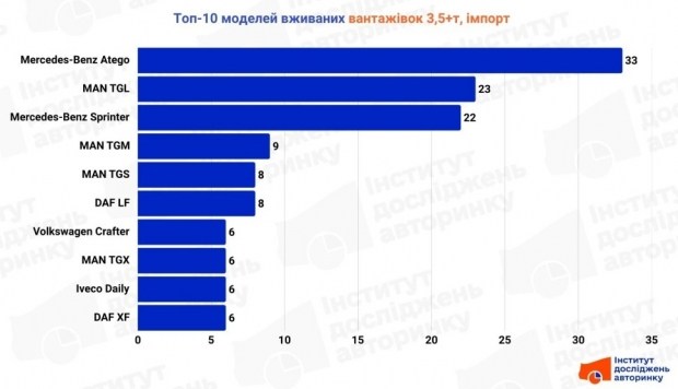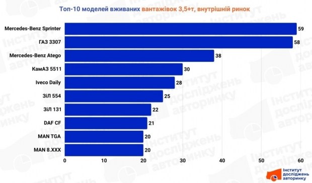 Ситуація з моделями стабільно контрастна: з одного боку - сучасні машини європейських брендів, з іншого - техніка ще з радянських часів, яка, попри вік, досі перебуває в обігу. Лідирує цього разу Mercedes-Benz Sprinter, його «важкі» версії. Другий у списку ГАЗ-3307 - типовий приклад «спадку союзу», що все ще намагається триматись у строю. Далі у списку - звиклий мікс із ЗіЛів та КамАЗів та машин відомих європейських виробників.