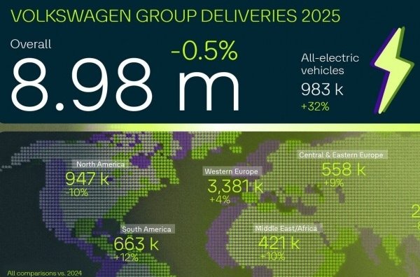 Volkswagen Group оприлюднила підсумкові дані щодо глобальних поставок за 2025 рік, які свідчать про відносну стабільність бізнесу на тлі складних ринкових умов. Загалом концерн реалізував у світі 8 983 900 легкових і вантажних автомобілів, що лише на 0,5% менше, ніж у 2024 році. У компанії наголошують, що збереження майже торішнього рівня продажів стало можливим завдяки сильним позиціям у Європі та Південній Америці, які частково компенсували спад на окремих ключових ринках.
