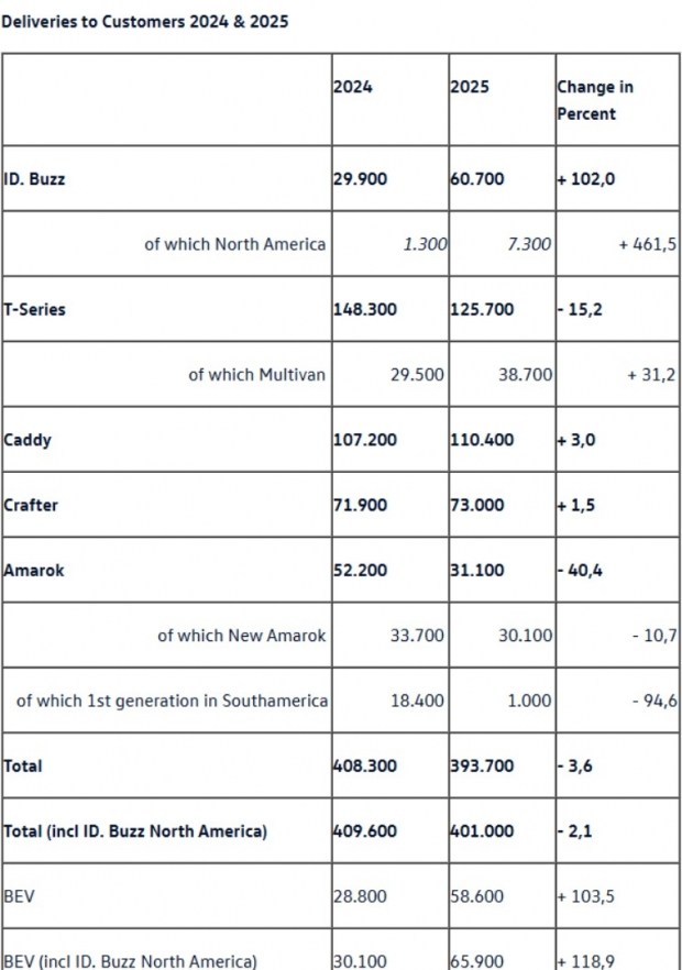 Якщо говорити про загальні поставки комерційних автомобілів Volkswagen у 2025 році, то вони склали 393 700 од. (- 3,6%), а з урахуванням продажів ID. Buzz на ринку Північної Америки - 401 000 од. (-2,1%).