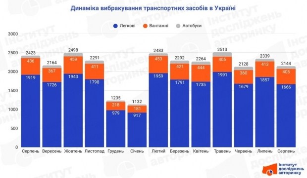 Найчастіше списують легкові автомобілі, зокрема впродовж серпня 2025 року відбулося 1666 звернень щодо їхнього вибракування. Також назавжди зійшли з доріг 405 вантажівок та 73 автобуси.