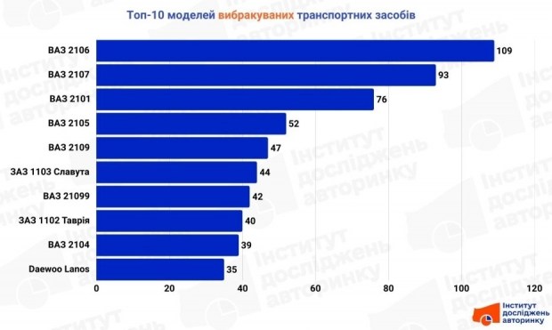 Фахівці ІДА визначили ТОП-10 моделей транспортних засобів, які офіційно знімалися з обліку у зв'язку з вибракуванням. Найчастіше тут можна побачити різі продукти від ВАЗ - майже все «класичне» сімейство, яке доповнюють «дев'ятка» та 99-та модель. Компанію їм складають ще три легковики місцевого виробництва - «Таврія» та похідна від неї «Славута», а також «продукт національного автопрому» з корейським корінням - Daewoo Lanos.