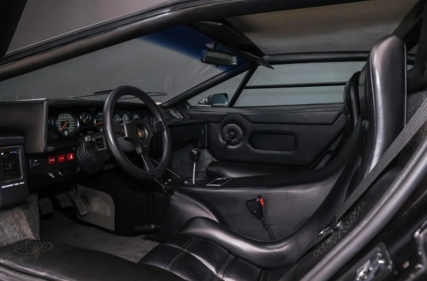 Салон Lamborghini Countach LP 5000 QV оздоблений чорною шкірою. Комплектація включає золотисті 15-дюймові диски, кондиціонер, магнітолу Alpine та велетенське антикрило.