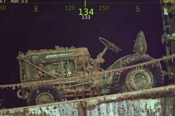 Трактор стоїть прив'язаний ланцюгами на палубі затонулого американського авіаносця USS Hornet (CV-8). Як йдеться у повідомленні historyfeels на Instagram-сторінці та в ряді інших джерел, стан гарно збереженого трактора зафіксувала підводна камера.