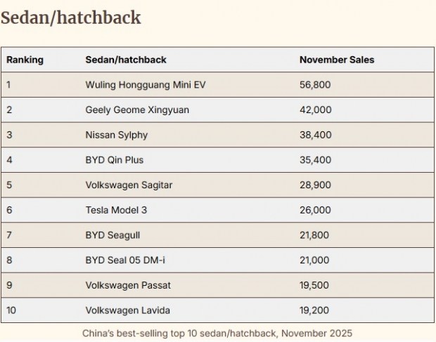Сегмент седанів і хетчбеків у цілому показав слабку динаміку: продажі скоротилися до 1,007 млн автомобілів, що на 10% менше, ніж рік тому. Цікаво, що попри активну електрифікацію ринку, значну частку в десятці найкращих зберігають бензинові моделі, зокрема Nissan Sylphy та Volkswagen Passat, Lavida і Sagitar.