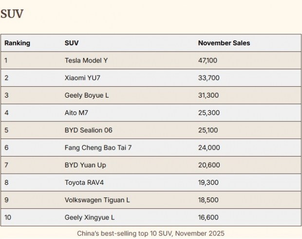 У категорії позашляховиків лідерство впевнено утримує Tesla Model Y. У листопаді кросовер розійшовся тиражем 47 100 одиниць, показавши вражаюче зростання майже на 142% у порівнянні з попереднім місяцем. Сукупні продажі Model Y з початку року вже наблизилися до 360 тисяч автомобілів. Другу позицію посів Xiaomi YU7, який продемонстрував стабільні результати з 33 700 проданими машинами, а третє місце дісталося Geely Boyue L.