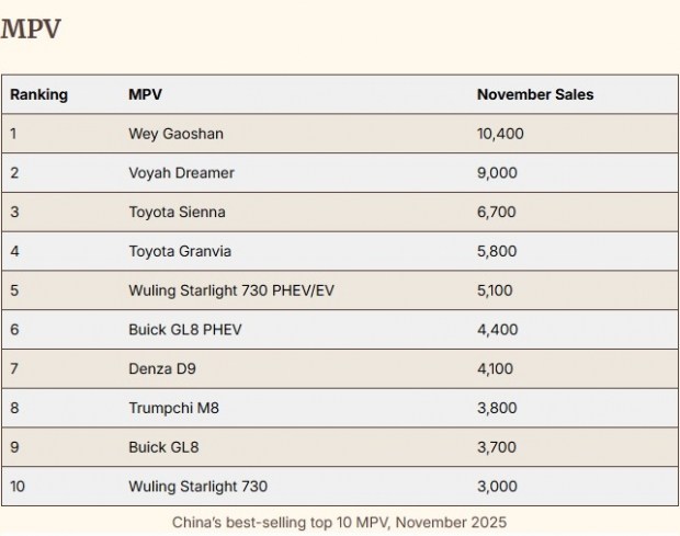 Продажі мінівенів залишаються найменшими серед основних сегментів - 86 тисяч одиниць за місяць. Хоча показник трохи зріс у порівнянні з жовтнем, у річному вимірі спад склав майже 17%. Найпопулярнішим мінівеном листопада став Wey Gaoshan, який зберігає сильні позиції у преміальному сімейному сегменті.