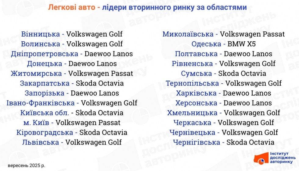 Покупці обирають знайоме, перевірене, зрозуміле. Golf і Lanos - два полюси одного феномену: любові до простоти. А Octavia та Passat утримують баланс між розумом і престижем. І лише Одеська область вирішила написати власну історію - з повним приводом та шкіряним салоном.