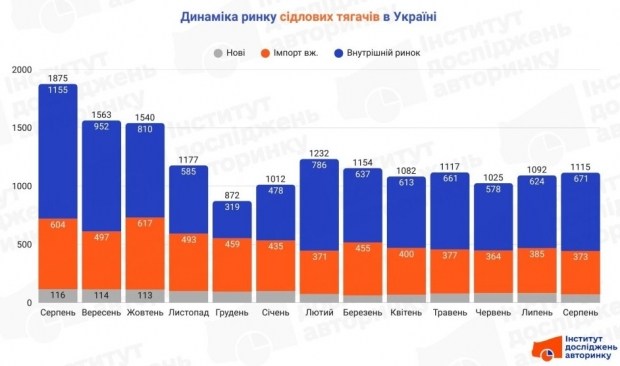 Впродовж серпня 2025 року українці сумарно придбали 1115 нових та вживаних сідлових тягачів. Цей показник на 40,5% менший у порівнянні з результатами аналогічного періоду 2024 року, але на 2,1% більший відносно липня цього року.