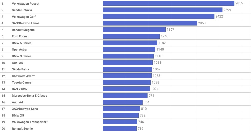 Третю сходинку зайняв Volkswagen Golf (2,4 тис. угод), а на четвертій розташувався Daewoo Lanos (2 тис. угод). Замикає першу п’ятірку Renault Megane (1,4 тис. угод).