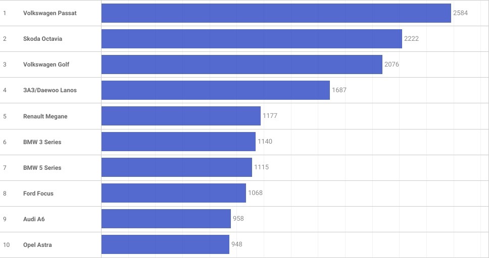У списку моделей першість залишається за Volkswagen Passat - було б дивно, якби це місце дісталося якійсь інші марці, адже щомісяця «Пасат» увесь минулий рік гордо поглядав звисока на інших учасників рейтингу. Також високий попит зберігався на Skoda Octavia та Volkswagen Golf.