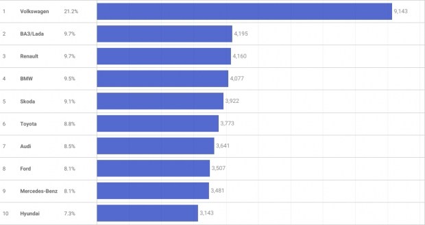 Яким маркам частіше надавали перевагу українці? Як і в попередні періоди, впевнено лідирує «народний» бренд - Volkswagen, частка якого склала 21,2%, що значно більше, ніж у марок, котрі розмістилися за ним у списку. Друга сходинка дісталася ВАЗ, від якого лише на кілька угод купівлі-продажу відстає Renault, котрий на третій позиції.