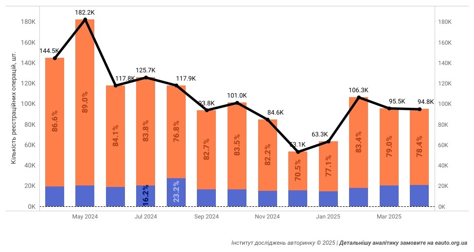 На внутрішньому ринку впродовж квітня 2025 року сервісні центри МВС зареєстрували майже 74,3 тисячі угод купівлі-продажу вживаних легковиків. Це на 1,6% менше у порівнянні з березнем-2025, та на 40,7% менше ніж у квітні-2024, проте тоді ще тривав так званий «бум переписувань» транспорту.