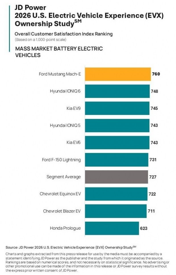 Експерти опитали 5741 власника електрокарів 2025 та 2026 року випуску та дізналися їх враження про нові авто. На основі їх відгуків підраховують так званий індекс задоволеності. Цьогоріч він склав 786 балів у преміальному сегменті та 727 - у масовому.