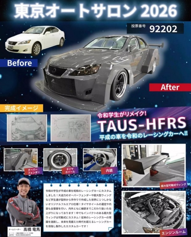 Проєкт під назвою TAUS-HFRS створили студенти Автомобільного коледжу Кокура Гакуен Гунма. Це не серійна модель і не тюнінг від відомого ательє, а дизайнерське дослідження, яке одразу привернуло увагу своєю радикальною зовнішністю, пише Carscoops.