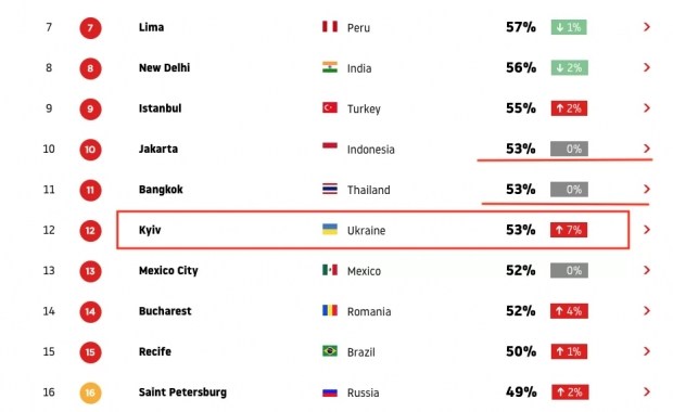 Расположившийся на 12-м месте в мировом рейтинге Киев идет следом за находящейся на 10-й позиции столицей Индонезии Джакартой и занимающей 11-е место столицей Таиланда Бангкоком. При этом, все 3 города имеют одинаковый индекс TomTom – 53%. А "отставание" Киева в рейтинге является в данном случае скорее не позитивным, а негативным фактором.