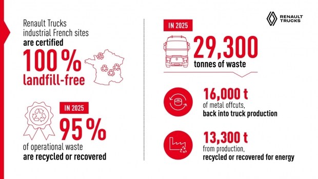 Чотири французькі заводи Renault Trucks - у Бленвіль-сюр-Орн, Бург-ан-Бресі, Ліоні та Ліможі* - отримали сертифікат «Без захоронення відходів на звалищах» (Landfill Free). Ця сертифікація допомагає знизити вплив промислової діяльності на довкілля. Окрім запобігання захороненню відходів на звалищах, вона заснована на структурованих довгострокових програмах зі скорочення, повторного використання та переробки відходів, що впроваджуються на всіх промислових об'єктах.