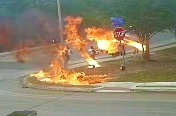 В передмісті Сан-Антоніо (штат Техас) ледь не сталася трагедія. В мережу потрапив запис з камери відеоспостереження, на якому видно, як некерований палаючий мотоцикл врізався в бордюр на перехресті, ледь не поранивши групу з чотирьох дітей, що перебували на тротуарі.