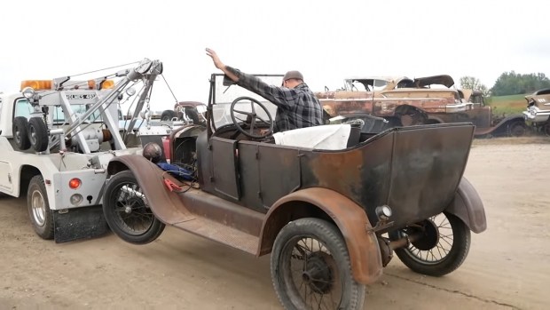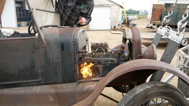 Двигун Ford T покритий шаром бруду, а у двох його циліндрах знайшли гнізда мишей. Мотор відчистили і відремонтували магнето та подали пальне - і він ожив, хоча при цьому навіть загорівся.